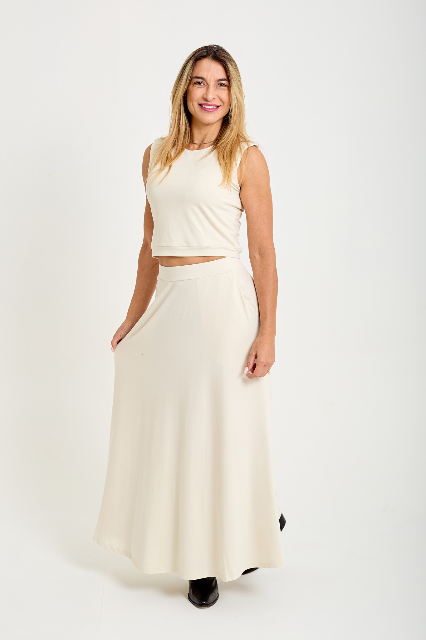 Regata cropped com tomas no ombro e saia longa, ambos confeccionados em um tecido macio, suave e com caimento e movimento lindos!